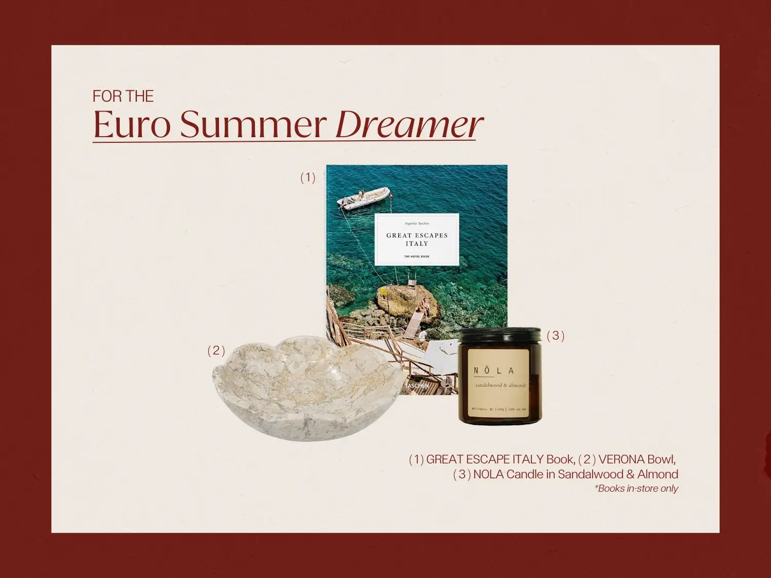They gravitate towards warm neutrals, sculptural silhouettes and breezy textures. Our VERONA bowl styled on the table, pages of Great Escapes Italy sparking daydreams of the next adventure, and the soft glow of the NOLA Candle in Sandalwood and Almond set the tone. Layer in coastal ceramics, travertine décor, stone bowls and soft linens for an effortless way to bring their favourite coastline home.