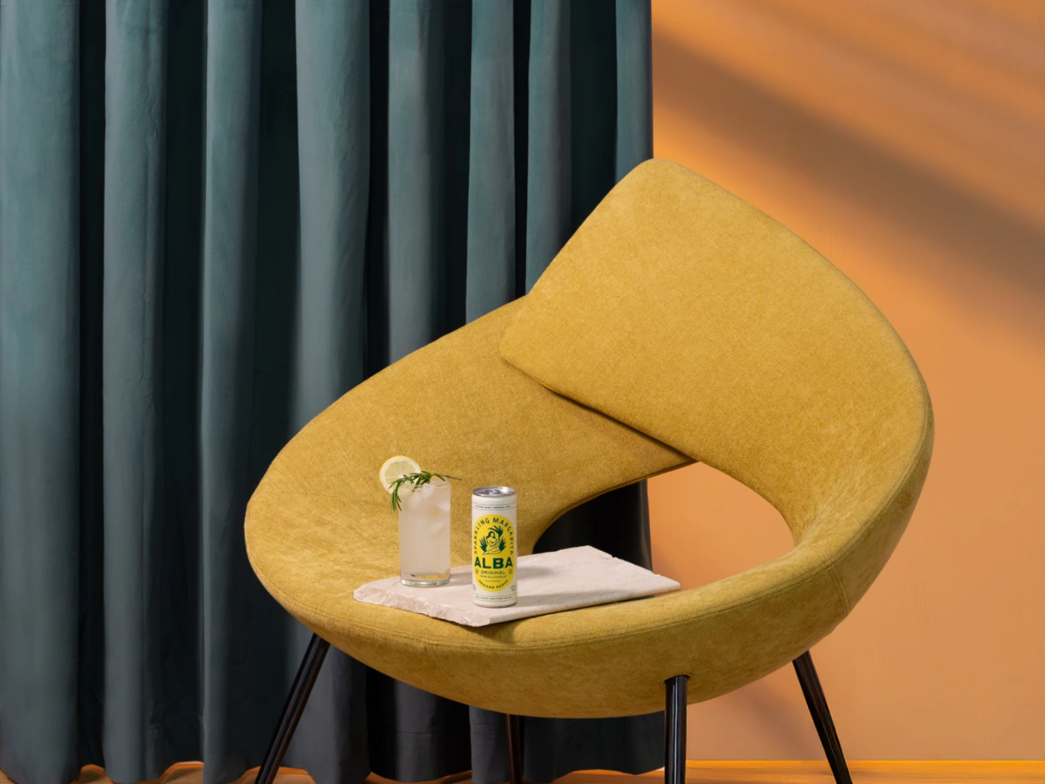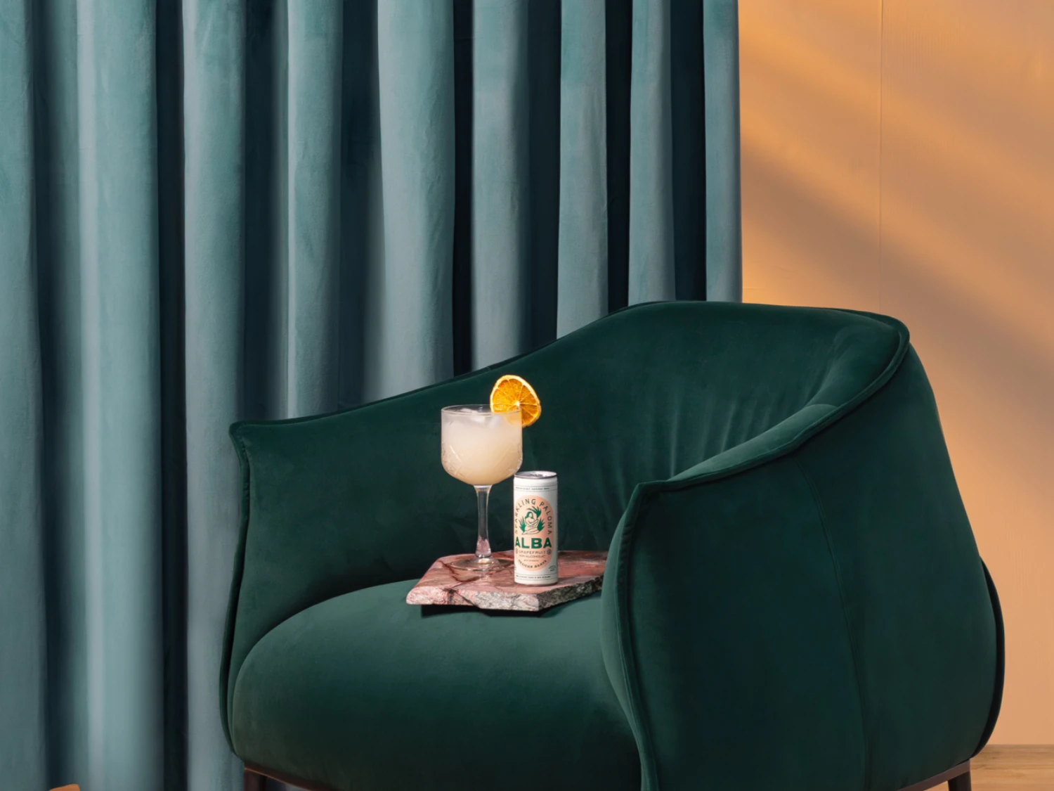 Lively and luminous, the Sparkling Paloma captures the spirit of summer: a mix of citrus, fizz, and effortless style. We paired it with the BONBON Accent Chair, whose deep green velvet and sculptural curves bring the same sense of sophistication with a playful edge.