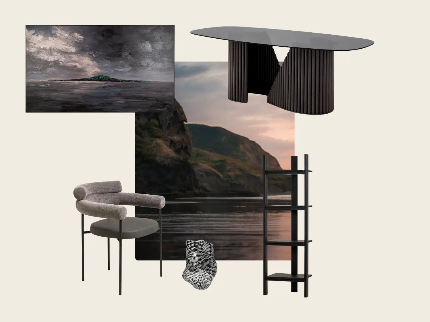The FITZROY Dining Table anchors the space with its curved timber form, paired with ALITA Dining Chairs that offer soft, textural comfort. The sculptural BUBBLE Vase and BY NIGHT Painting introduce movement and depth, while the TOCCA Bookcase adds balance with its open, architectural lines.