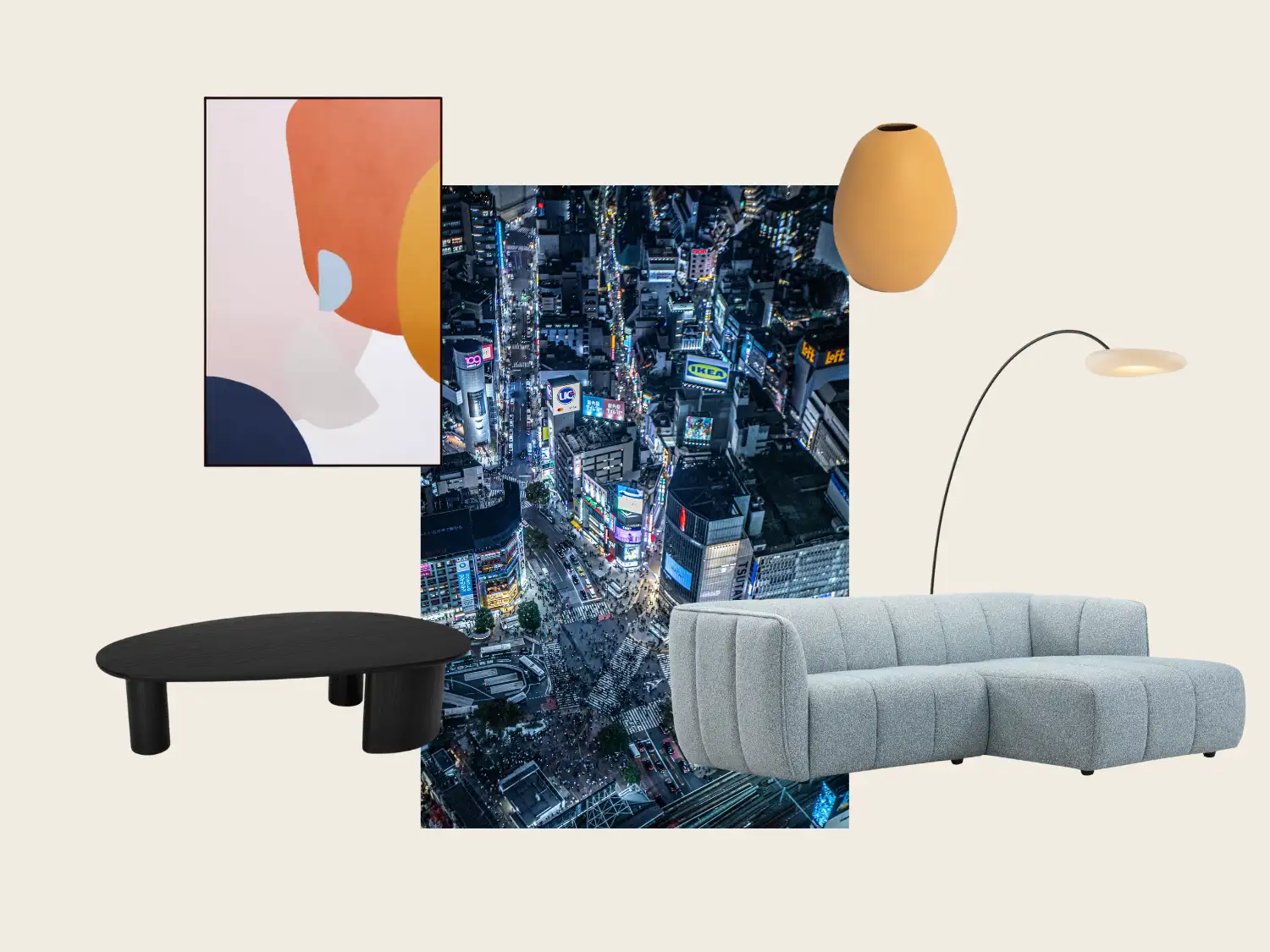 The OASIS Sofa grounds the space with its clean, curved silhouette, perfectly balanced by the sculptural form of the DELRAY Coffee Table The DARBY Vase and MEDIATED Painting introduce layers of depth and colour, adding warmth and personality to the palette. Finished with the gentle glow of the ARCO Floor Lamp, the look feels contemporary yet lived in.