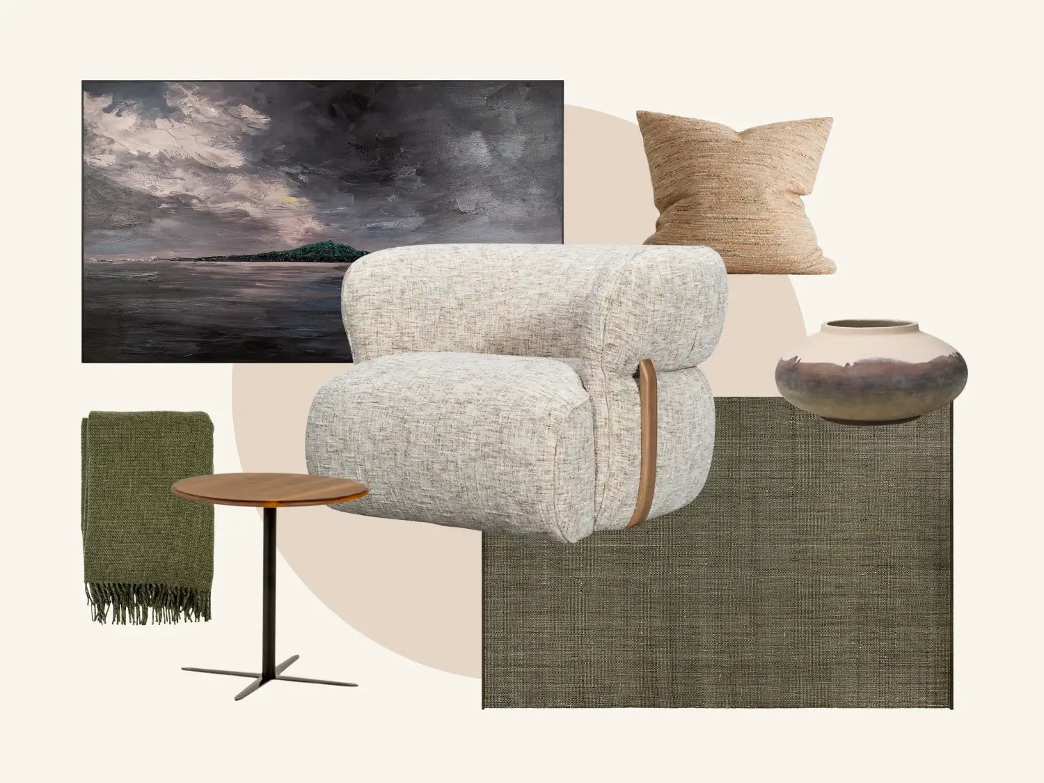 This one’s for the people who think green is a neutral (you’re correct). With a backdrop of broody coastal skies and all the texture you could dream of, it’s the moodiest kind of magic. There’s a softly structured boucle chair, a ceramic vessel that looks hand-touched by the earth, and layering in every olive, moss and taupe shade under the sun.