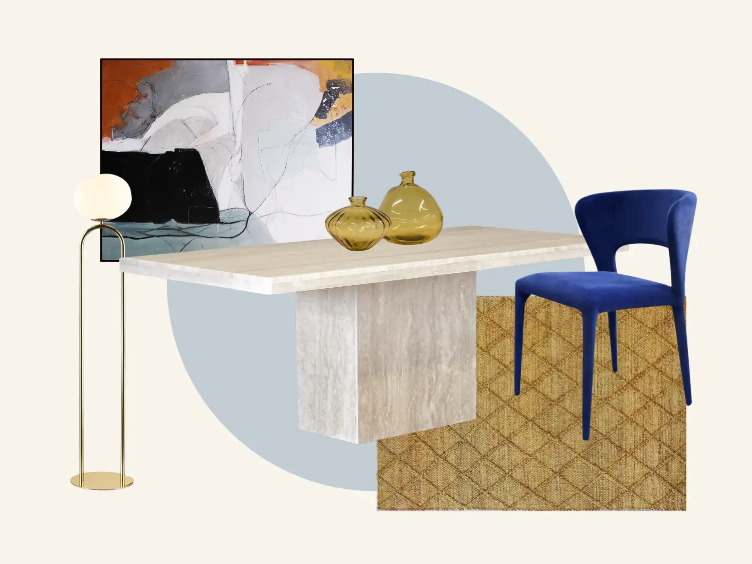 This is the one for rule-breakers. That chair? Cobalt velvet. That table? Sleek travertine with crisp, architectural lines. And the yellow glass vessels? They’re the jewellery of the room. Finish the look with a bold geometric artwork and a brass lamp.