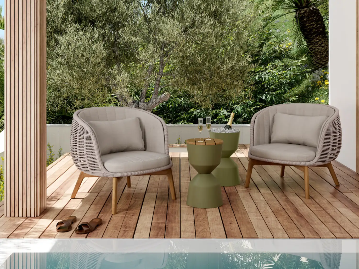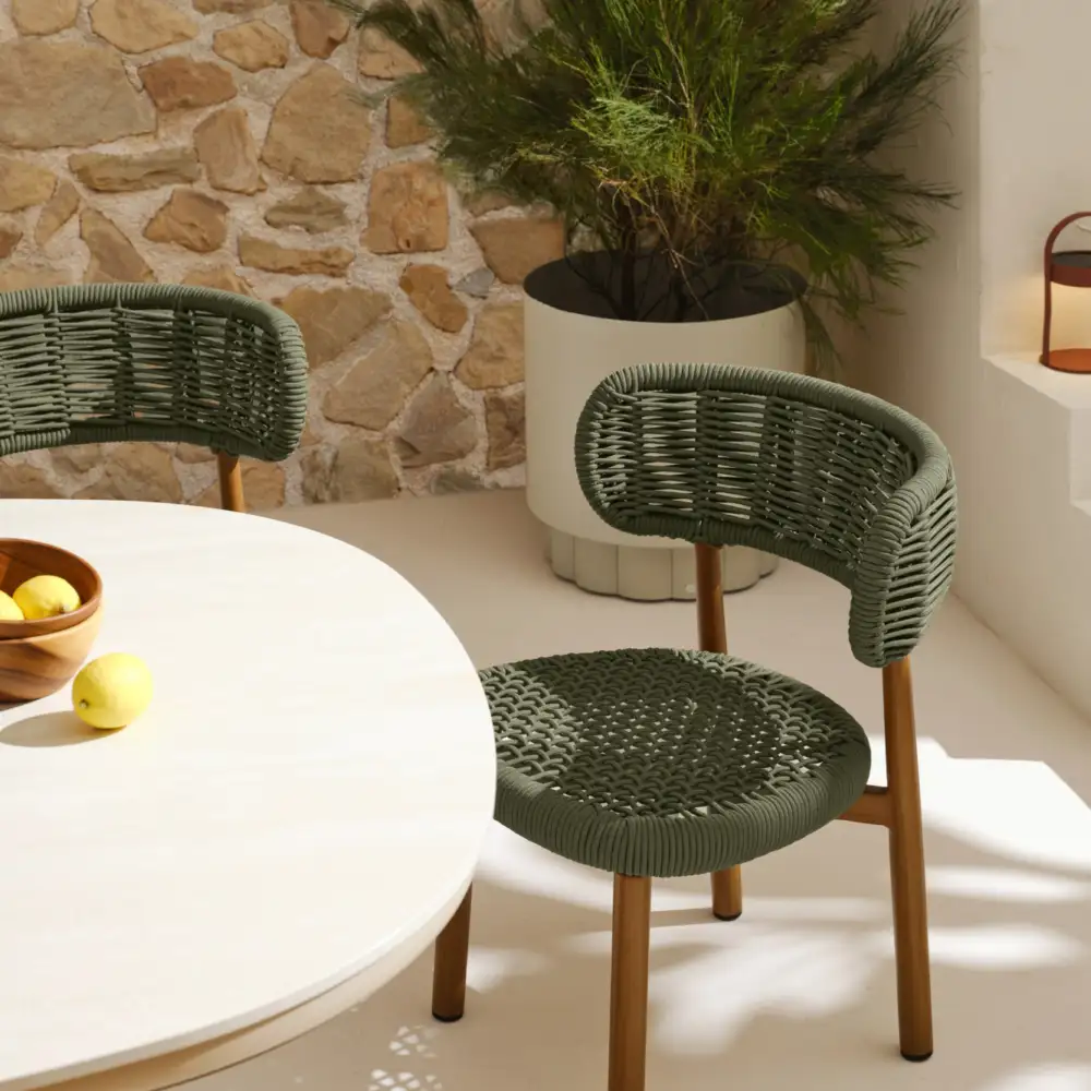 Our KORI Dining Chair, with its sophisticated khaki rope detailing, adds both texture and elegance, making it perfect for creating a relaxed, tropical vibe. Complementing this is the TUNIN Side Table, also in khaki, which doubles as an ice bucket, offering a seamless blend of form and function while enhancing the overall warmth of your outdoor space. This practical yet stylish feature makes it perfect for entertaining, adding both convenience and charm to your outdoor setup.