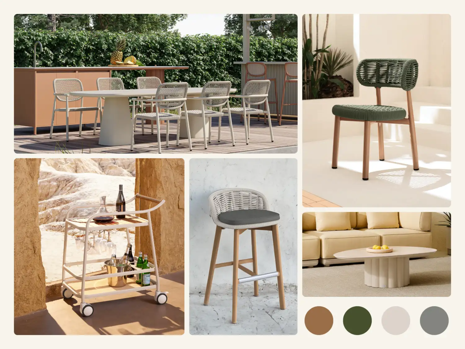 Get inspired to transform your outdoor living area with our curated mood board, featuring a selection of our brand-new outdoor furniture collection. Whether you're after modern elegance or cosy, rustic charm, our mood board offers the perfect blend of styles, accessories, and colour palettes to guide your design journey. Explore how our latest pieces can help you create a functional and stylish outdoor haven for every season.