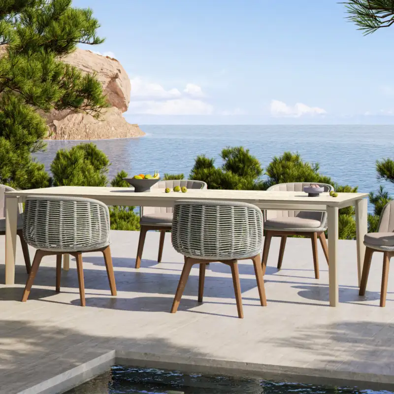 The LOTUS Dining Table exemplifies this with its modern design and luxurious finish, perfect for creating a contemporary outdoor dining experience. Paired with our BARCA Outdoor Lamps, which offer a warm and inviting glow, these pieces work together to bring a stylish contrast that elevates any outdoor space.