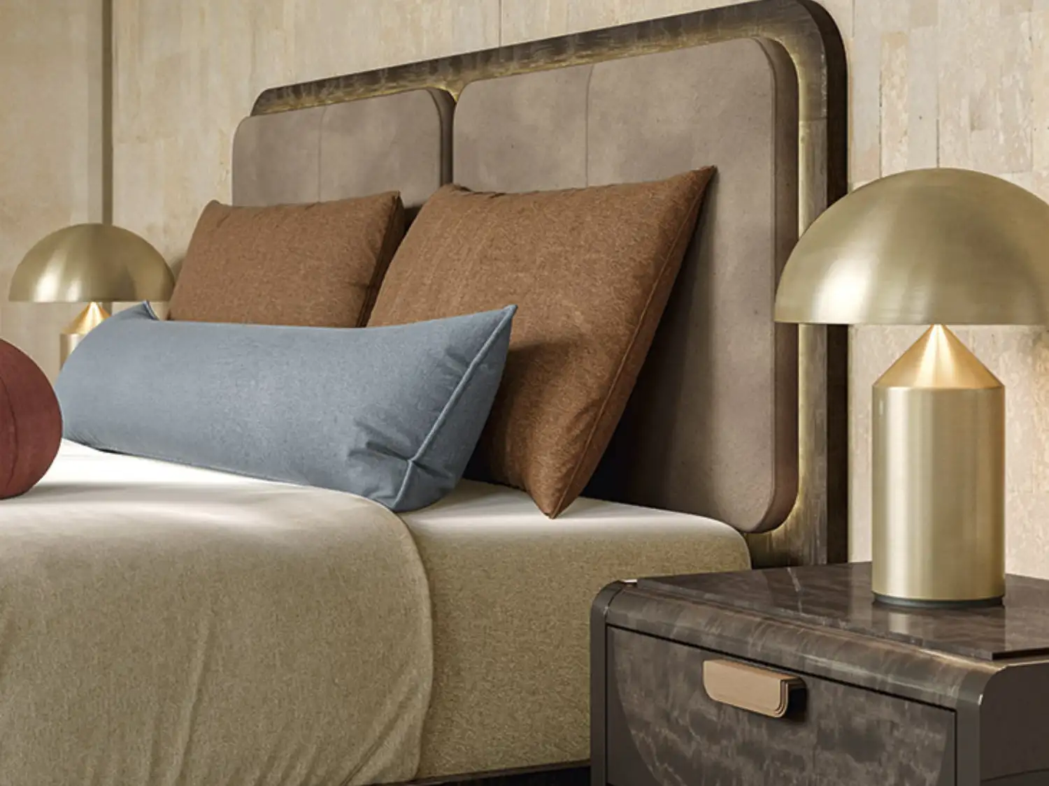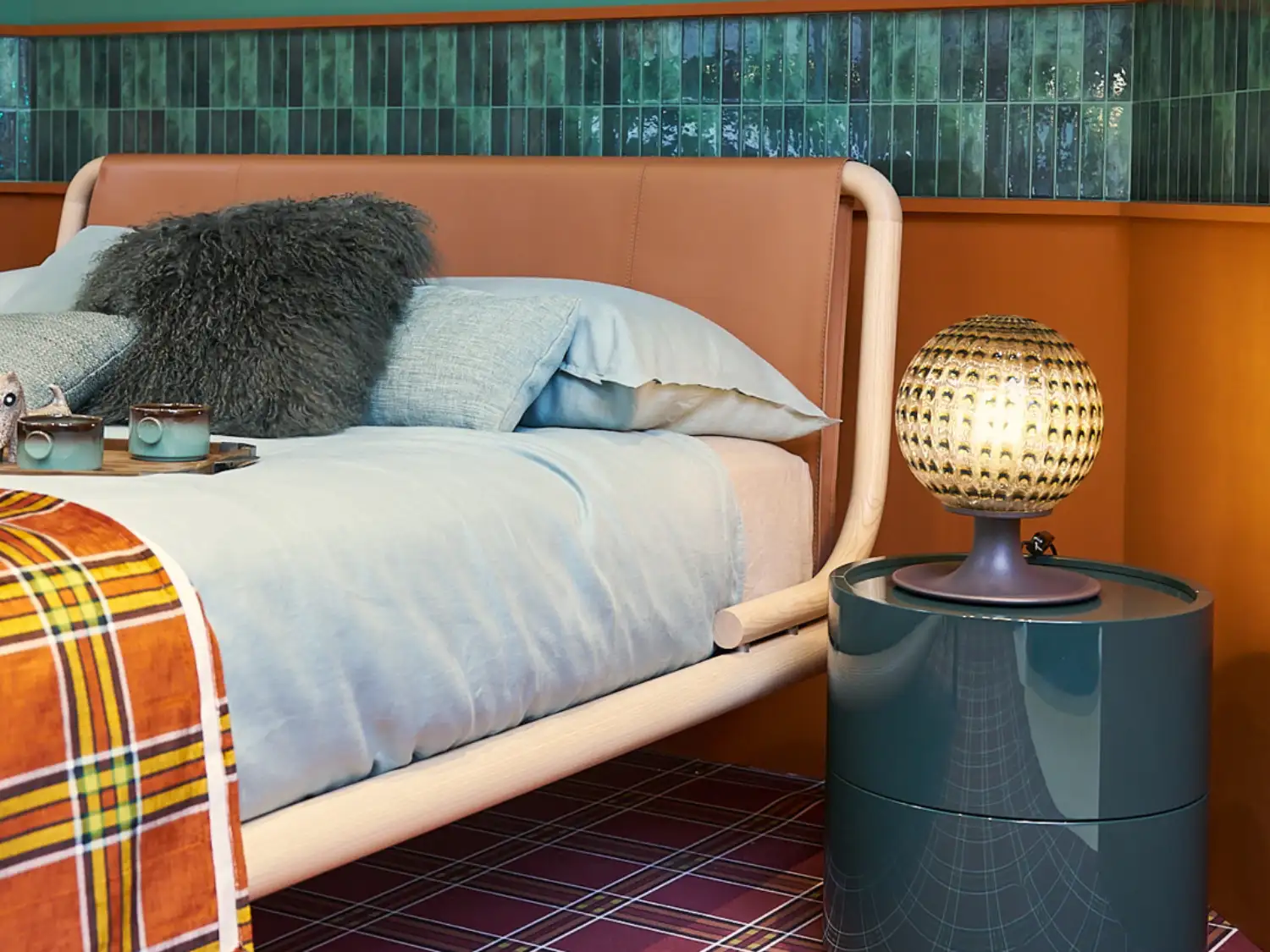 ROVI bed by Alf Da Frè anchors the look with its tubular frame and soft leather headboard, embodying 70s design with a modern twist.