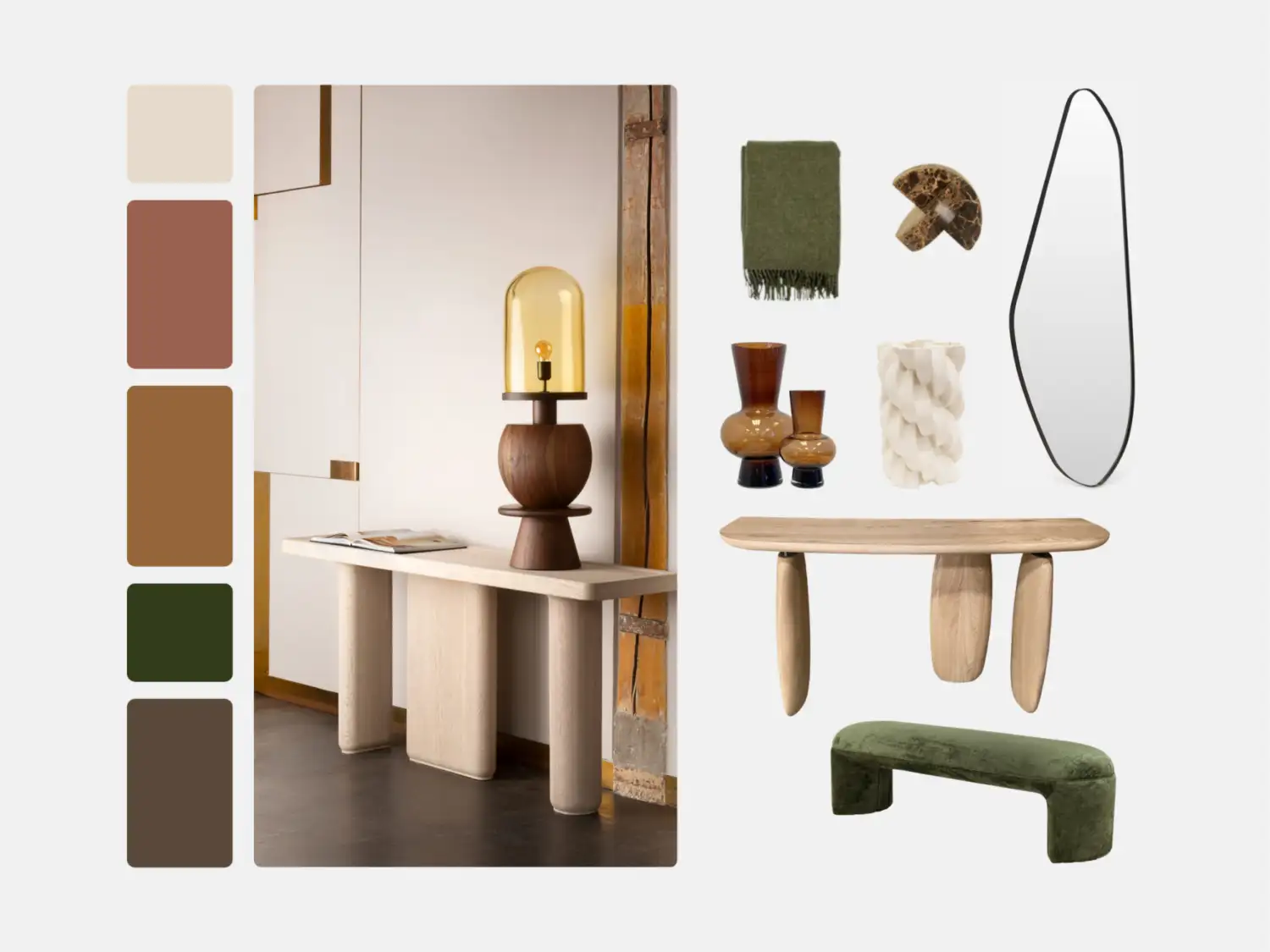 Grounded in nature, this palette draws on forest greens, clay browns and deep burgundy. The combination feels rich and dramatic, yet still fresh when layered with organic textures and sculptural shapes. A timber console such as the GAUDI introduces natural presence, while moss-toned seating, like the KIRIN Bench, brings depth and softness. Amber glass vases add a warm glow, tying the look together in a way that proves earthy shades can be just as evocative of spring as more floral tones.