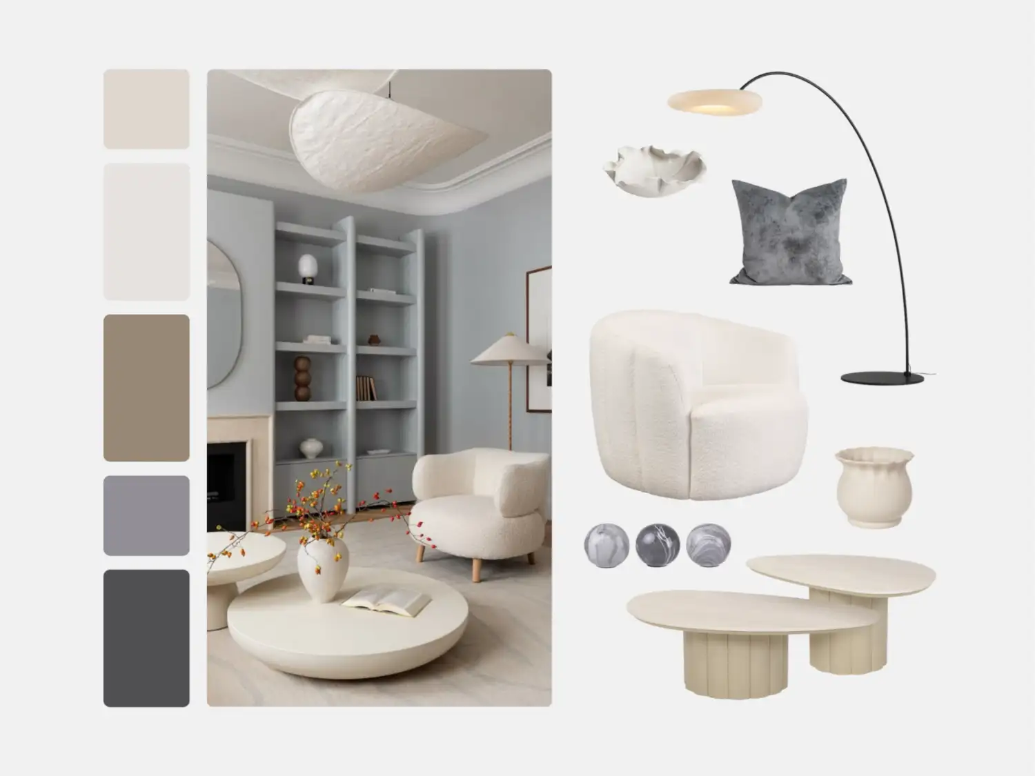 STEVY Accent Chair in boucle, VARSI Coffee Tables, ARCO Floor Lamp (coming soon), BLUFF Bowl, SWIRLO Ornament, BROSTE Flowerpot