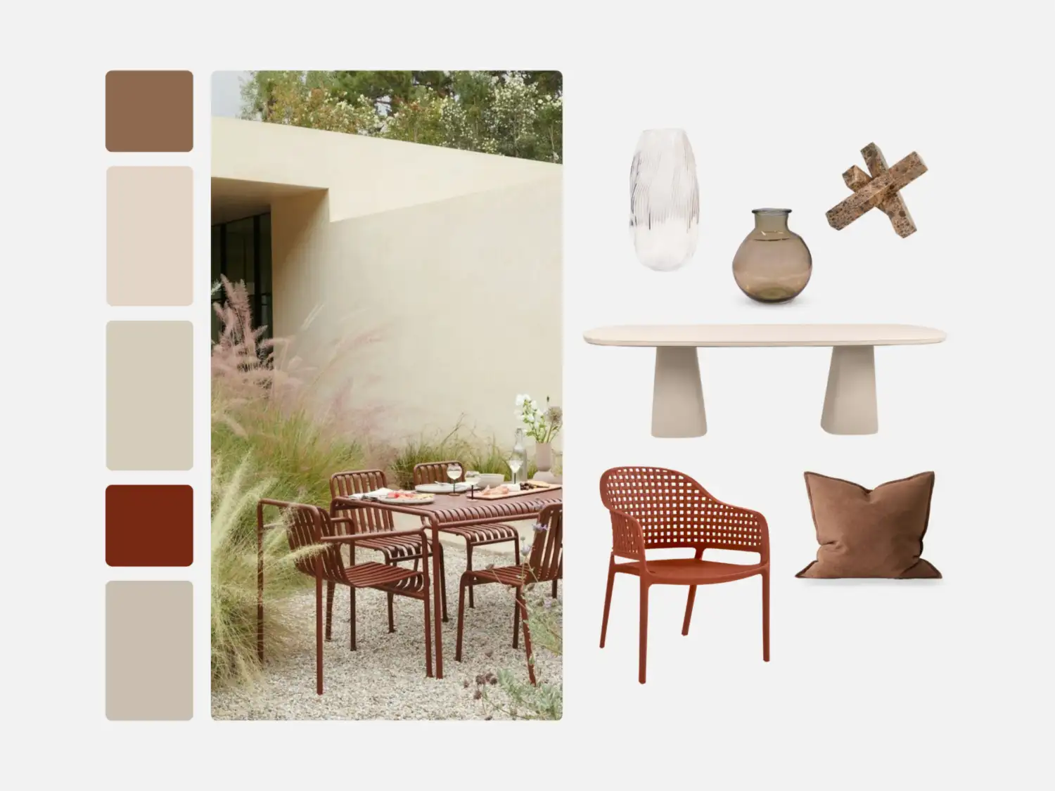 Terracotta and sandy neutrals evoke long, sunlit days and warm evenings outside. This palette celebrates the beauty of baked clay and stone. Lightweight seating, such as the COLLIER Dining Chair, brings playful structure, while the streamlined PODO Dining Table sets the stage for entertaining. Rustic ceramics and soft outdoor lighting complete the mood, creating a setting that captures spring’s energy in a refined and welcoming way.