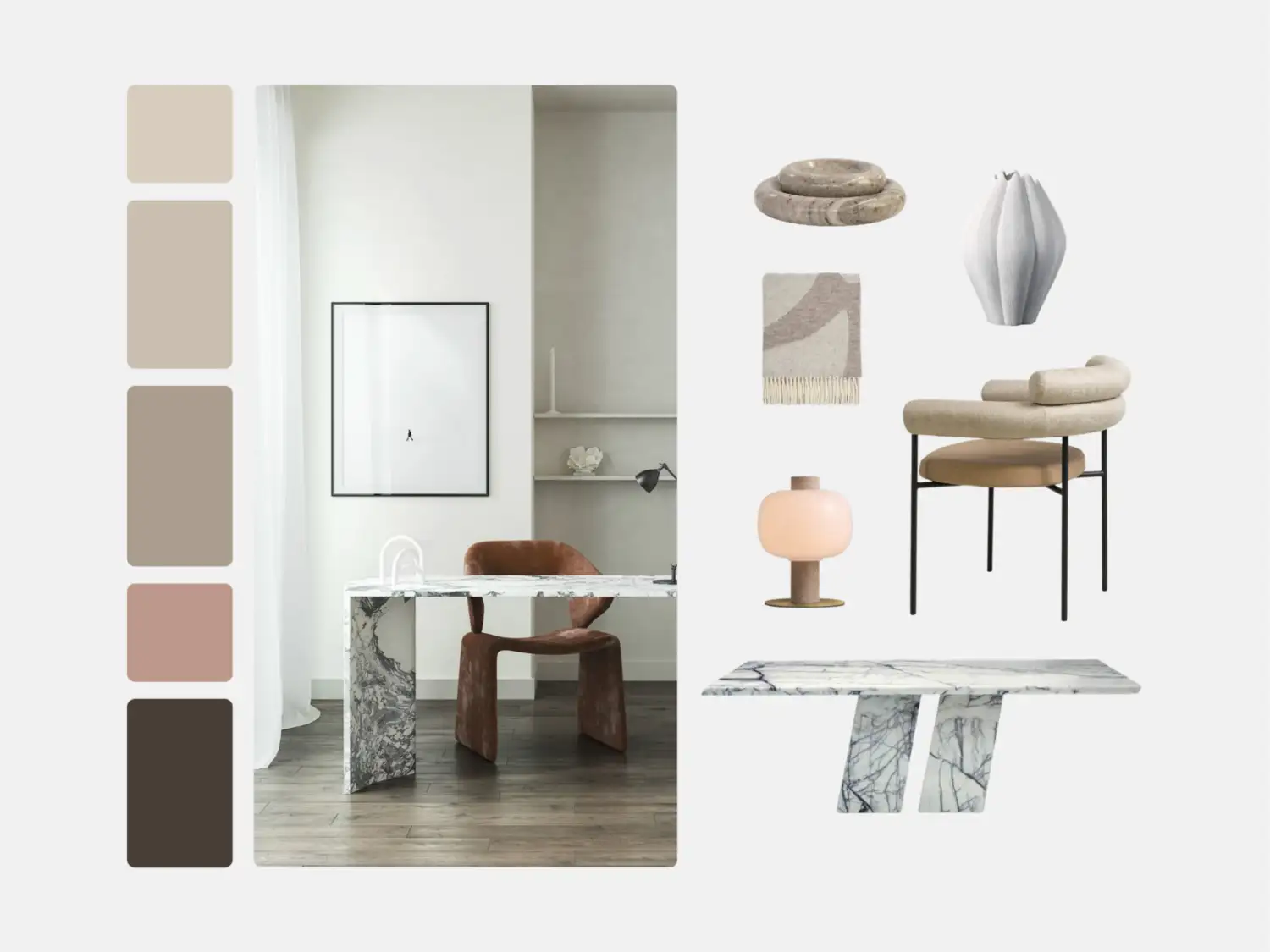 ERMES Dining Table in lilla marble, ALITA Dining Chair in biscuit & taupe, FLAGSTONE Throw, INDRA Bowl, CELESTE-I Vase, BRILL Table Lamp 34