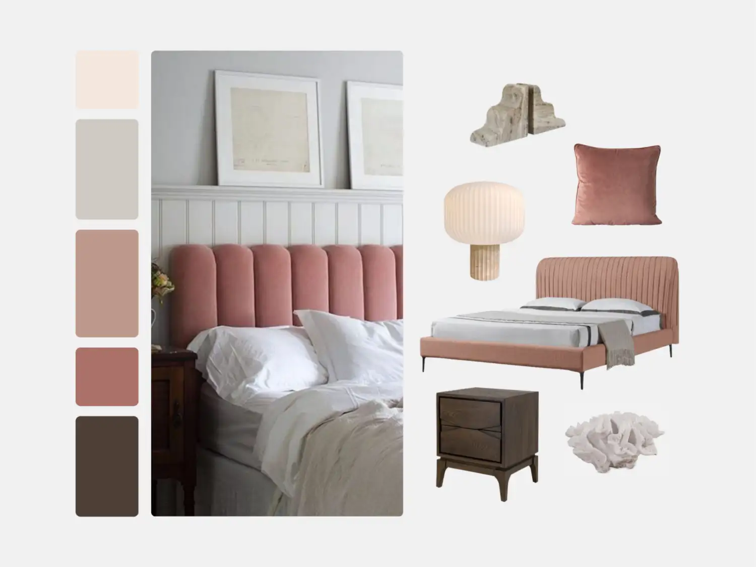 LYLI Bed in custom rose fabric, ROSELLO Bedside in solid grey oiled oak, WAVE Ornament, FAUX Coral Ornament, LYKTA Table Lamp 34, QUATTRO Cushion