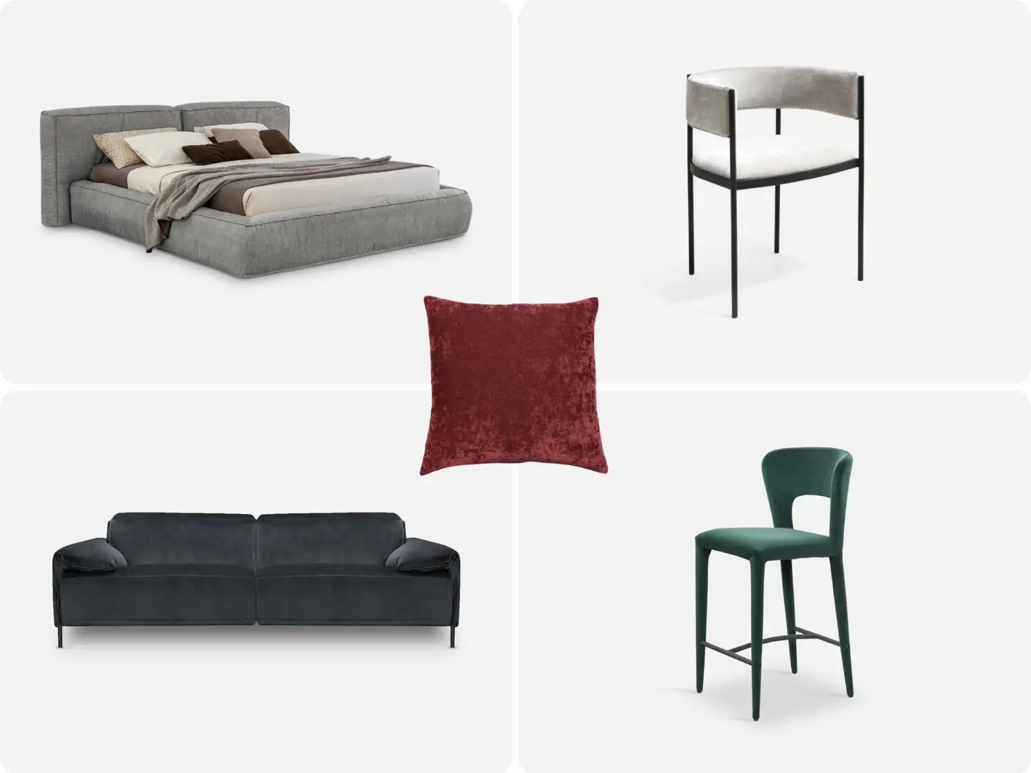 Left to Right: FLUFF Bed, ENVIE Dining Chair, EVELINA Sofa, PITCHER Barstool, LENNOX Cushion