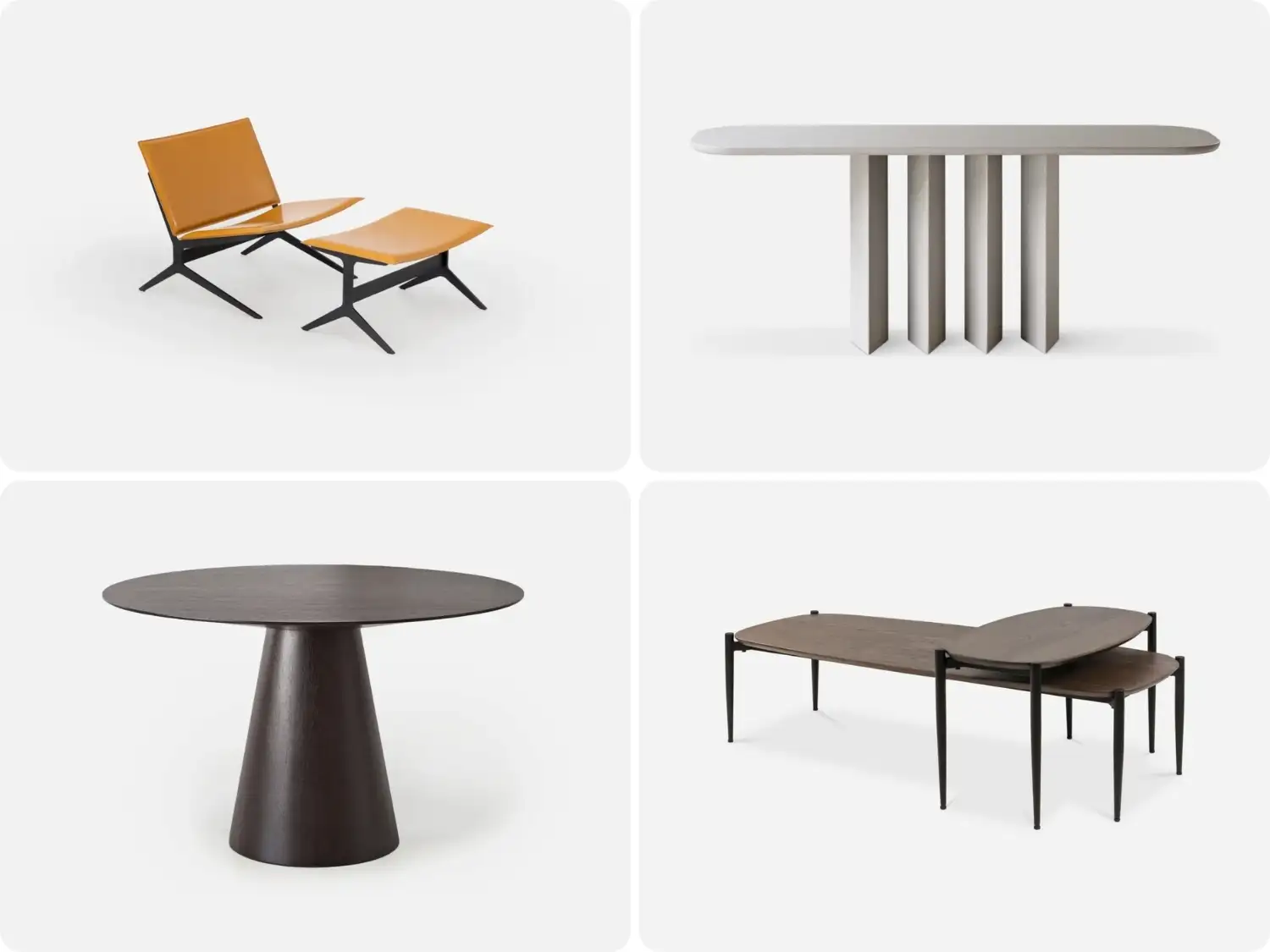 Left to Right: BRACCIO Accent Chair, GEOMETRIC Console , MANHATTAN Dining Table, SLOANE Coffee Tables