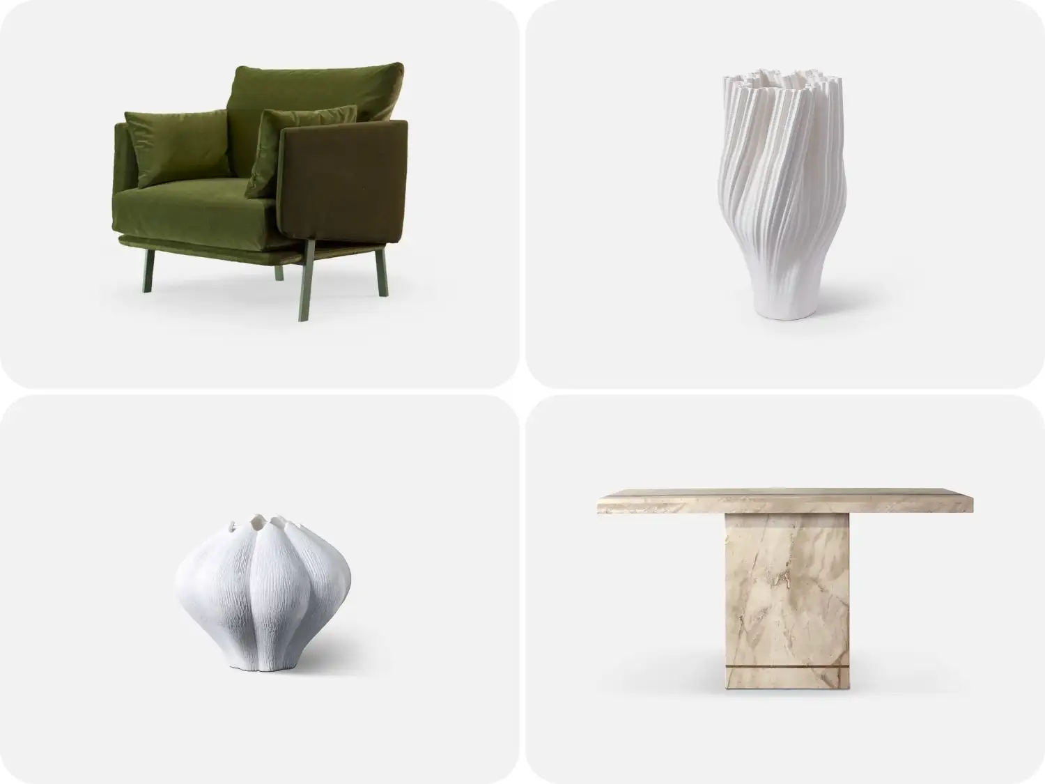Left to Right: STRUCTURE Accent Chair, BOHEME Vase, CELESTE Vase, PRINCE Console