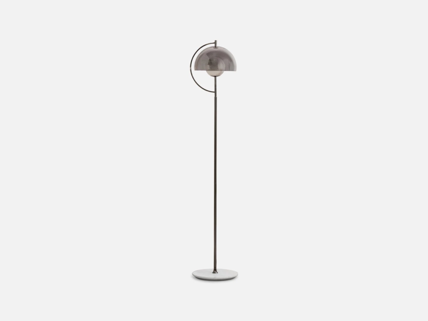 A floor lamp like TYRA is perfect for brightening darker schemes, with its smoked glass shade and marble base casting a soft, diffused glow that helps lighten the look of black furniture and lift the whole room.