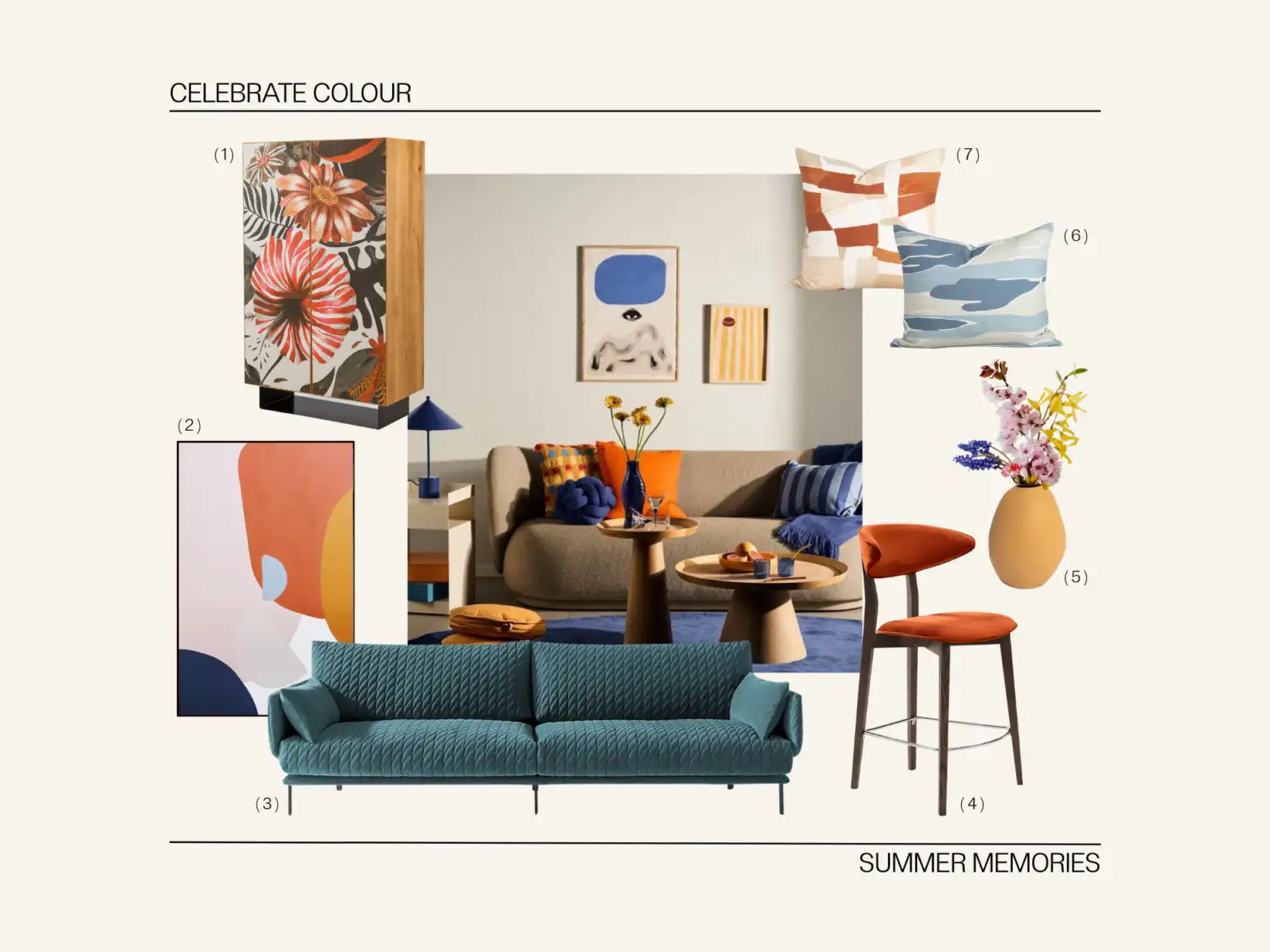 Moodboard Products: 1. LONDRA Buffet, 2. MEDITATED Oil Painting, 3. STRUCTURE Sofa by Bonaldo in Ego Fabric Blue, 4. FLARE Barstool by Natisa in Brick Velvet, 5. DARBY Ceramic Vase in Mustard, 6. REFLECTIONS Cushion, 7. LUCIO Cushion