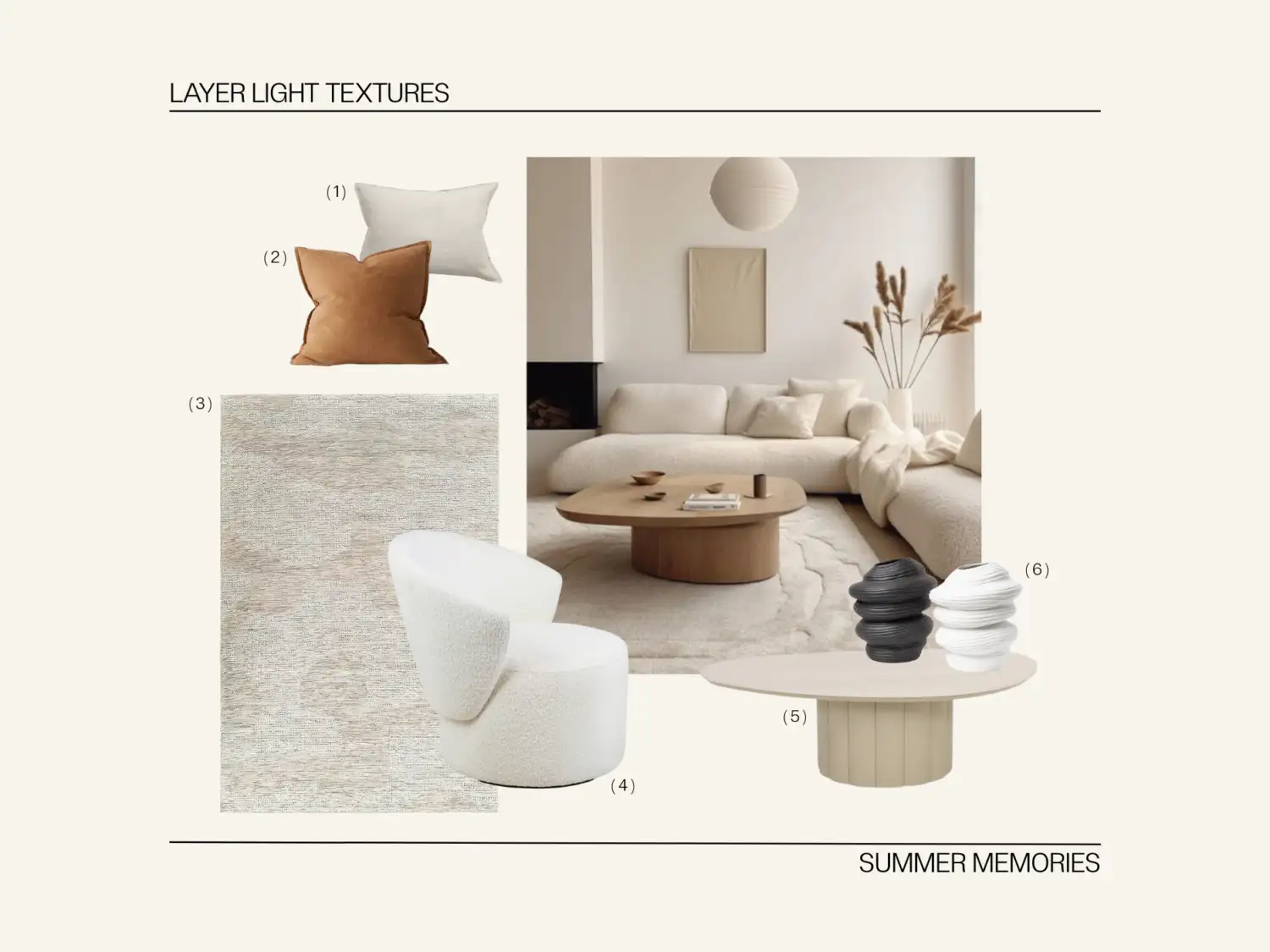 Moodboard Products: 1. ARCADIA Cushion in Almond, 2. FIORE Cushion in Ochre, 3. SANIBEL Rug, 4. SHELBY Accent Chair in Ivory Boucle, 5. VARSI Coffee Table, 6. CAPAS Ceramic Vases in White & Black