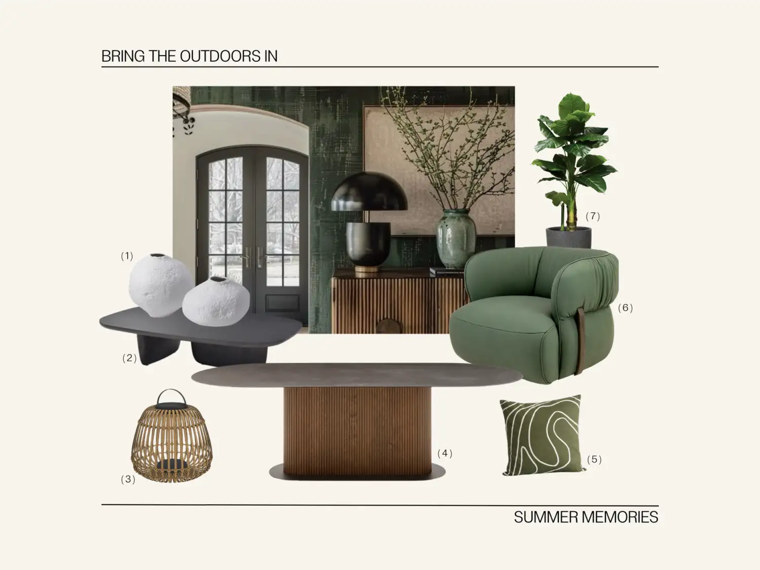 Moodboard Products: 1. HEDRON Vases, 2. GAUDI Coffee Table, 3. BARCA Portable Table Lamp, 4. RIGADIN Dining Table by Alf DaFrè, 5. PICCHU Cushion, 6. MONA Accent Chair in Emerald Leather, 7. TARO Faux Plant & INDIANA Vase