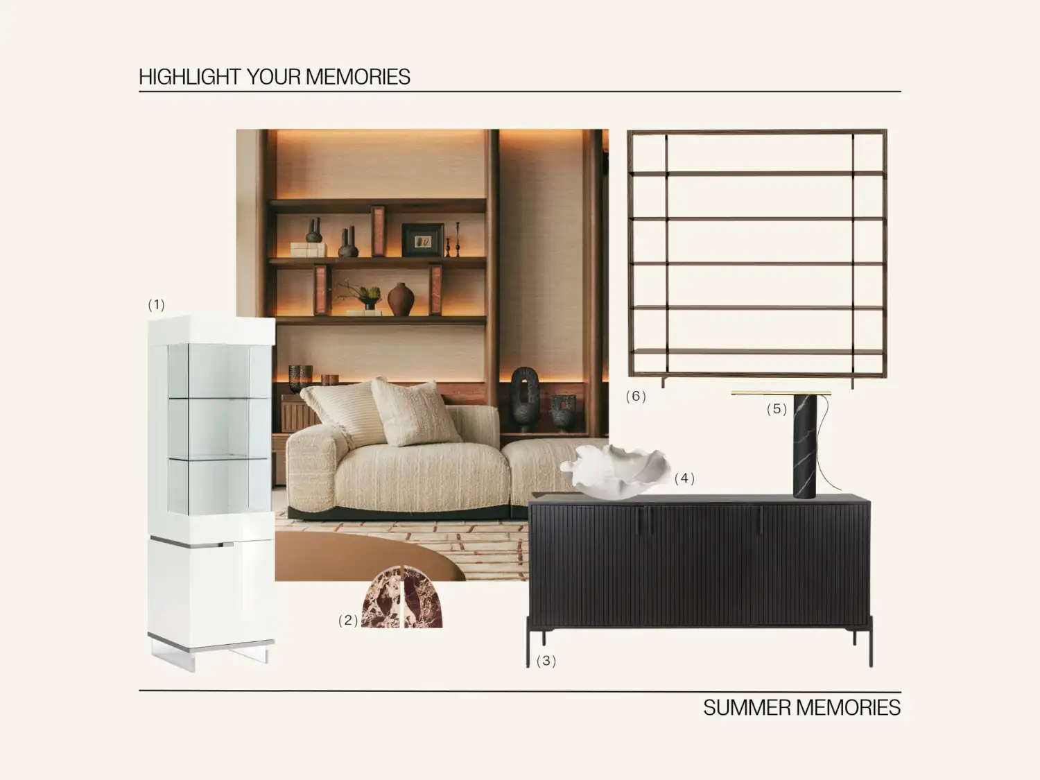 Moodboard Products: 1. ARTEMIDE 1-door Cabinet by Alf Italia in White High Gloss, 2. CURVE Marble Bookends 3. ALLUR Buffet, 4. BLUFF Bowl, 5. T.O Table Lamp in Black Marble. 6m ALIX Bookscase by Bonaldo