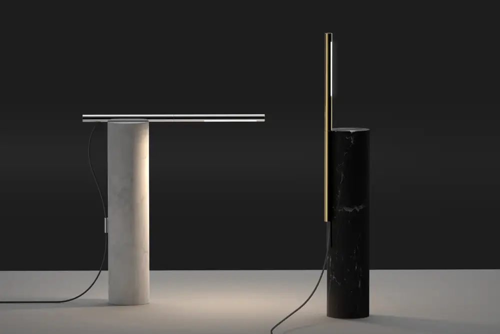 The T.O Lamp Range celebrates the importance of light as a pillar in our daily life. A monolithic column stands to support a horizontal and vertical line of light to provide precise light control in all directions. The adjustable light offers unlimited contexts for use in residential and workplace environments, all with a minimal footprint. It features a fully dimmable LED light source with a tactile push switch appropriately positioned at the end of the arm. Both table and floor versions feature a magnetically attached light arm on the marble base that can be rotated up to 360° degrees to provide both direct and indirect light for the task and ambient lighting needs alike.