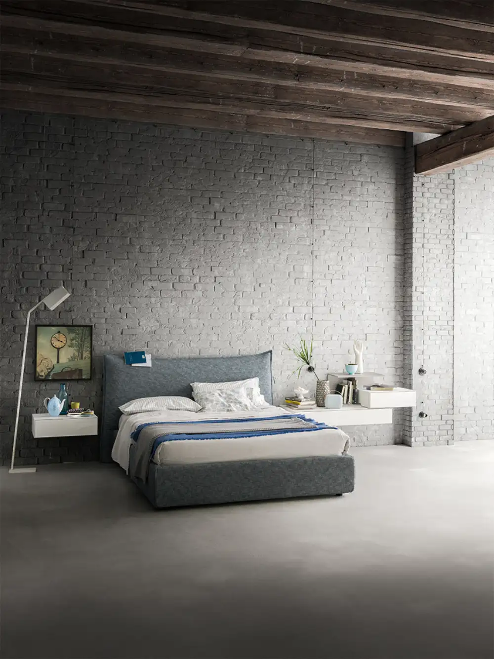 FRANCIS stands out with a fully upholstered, large angular headboard, simple platform, and sleek metal legs.