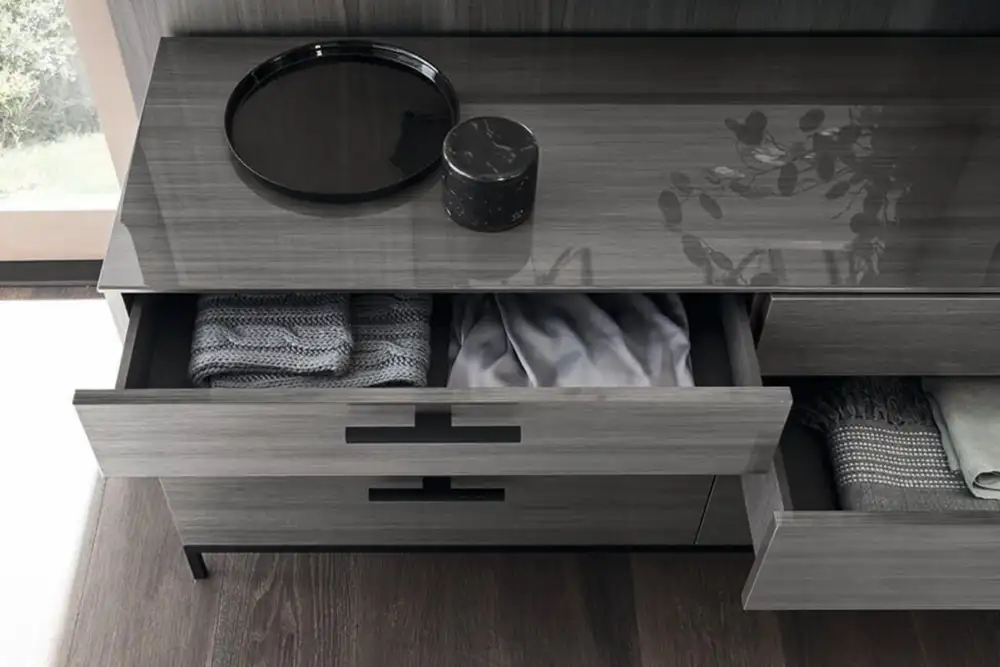 Beginning simply as Silverwood veneer, this 6 drawer dresser is applied with a lacquer that provides an ultra-high gloss, elevating the beauty of the veneer’s natural woodgrain. A finish characteristic of the Novecento collection, style this high gloss dresser alongside other pieces from the range to create a chic bedroom set.