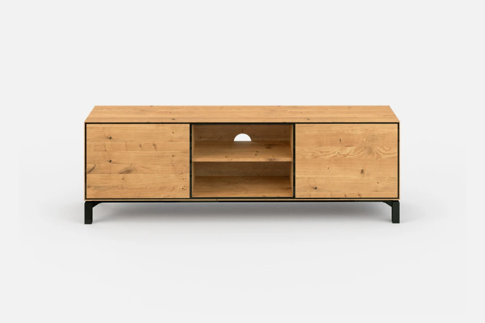 Combining the natural warmth of timber with a refined black frame, HYDE balances modern design with timeless appeal. Clean lines and thoughtful proportions create a sleek yet inviting look, while two closed compartments and open shelving provide practical storage.