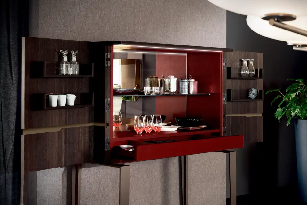 Crafted in heat-treated oak with refined gold detailing, ACCADEMIA opens to reveal a richly finished interior with mirrored backing, integrated lighting and thoughtfully designed shelving for bottles and glassware. A sophisticated statement for effortless entertaining.
