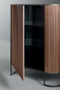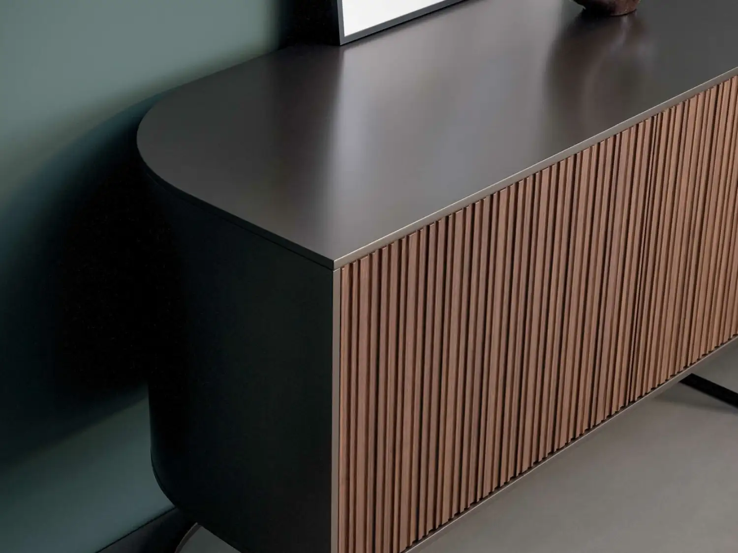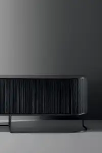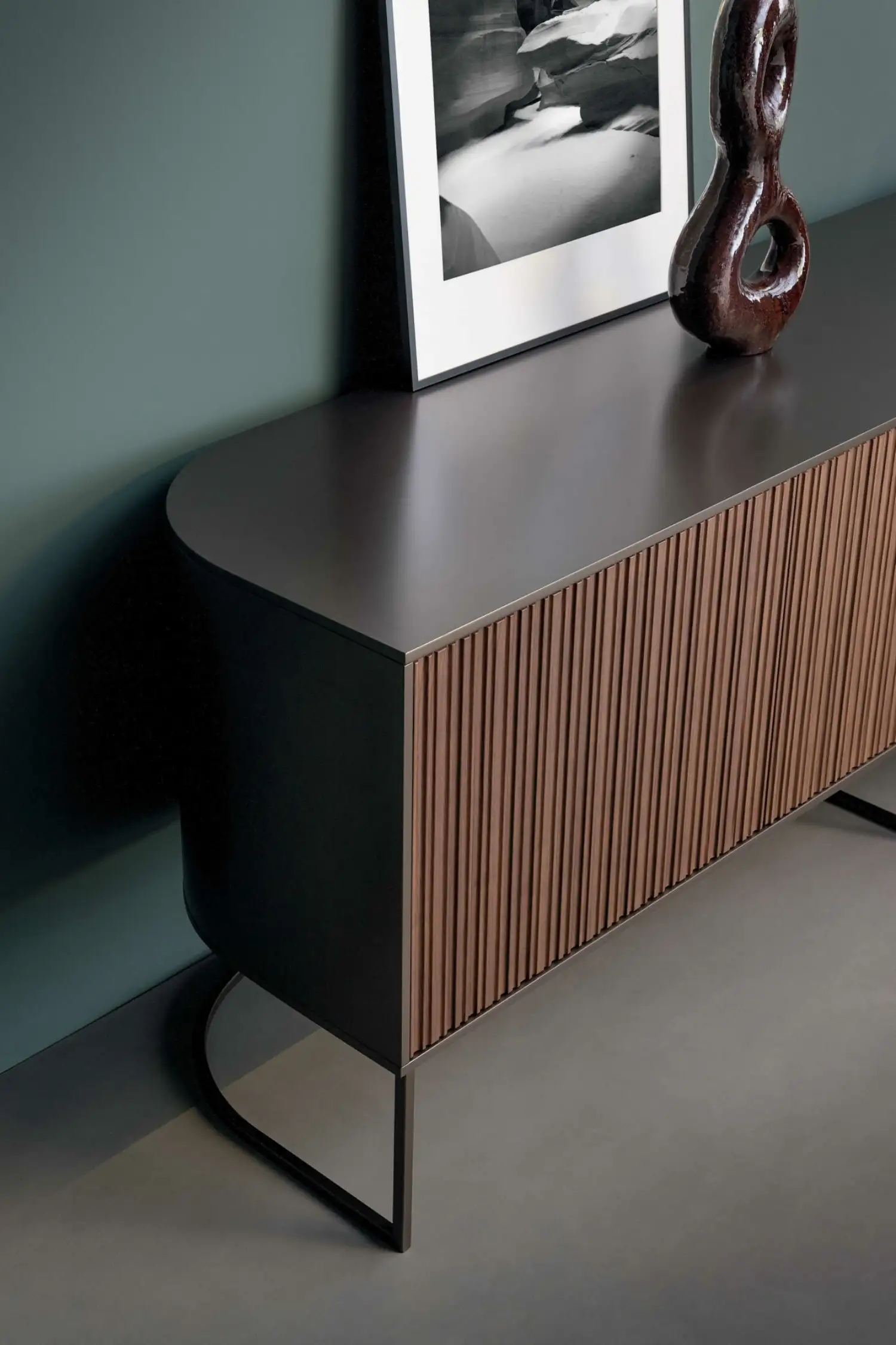 Its lacquered wood curves flow, creating a dynamic form that shifts with perspective
