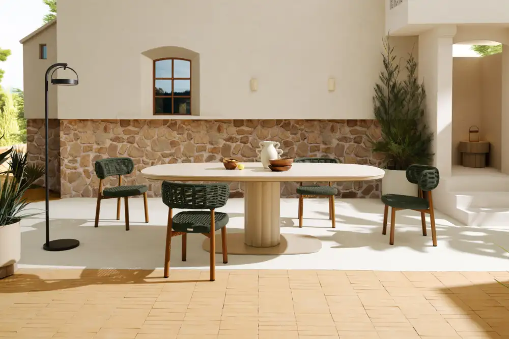New for Summer 24/25, KORI is a harmonious blend of comfort and style. Organic in form and hand-crafted with a military green rope, KORI is set on clean, teak-effect aluminium legs and effortlessly combines natural warmth with modern sophistication. Perfect for outdoor dining and relaxation.