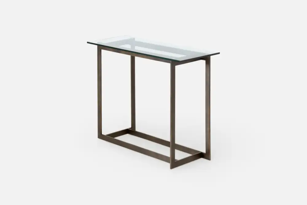 Clean lines and transparent top create an airy feel, while the matte bronze legs add a touch of industrial chic. Perfect for any entryway or living space.