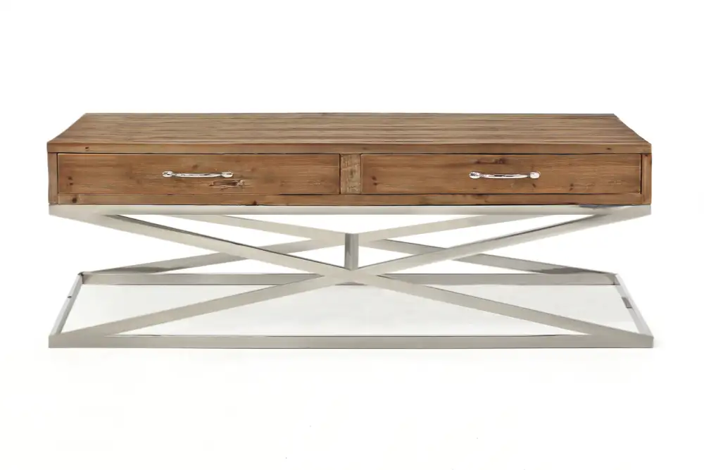 Marseille 2-drawer coffee table in old pine on a stainless steel crossed frame base.