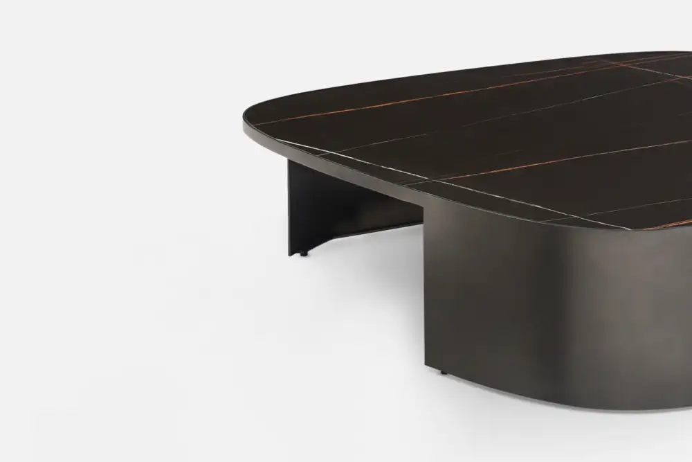 The CASCATA coffee table boasts an organic form, offering visual softness with its rounded edges and low stature, ensuring smooth access to your sofa. Supported by offset bronze-finished steel legs, it features a highly practical matt-finished Laurent ceramic top. The unique grain pattern, with ochre veining, adds warmth and texture to this exquisite piece, making it a perfect addition to your living space.
