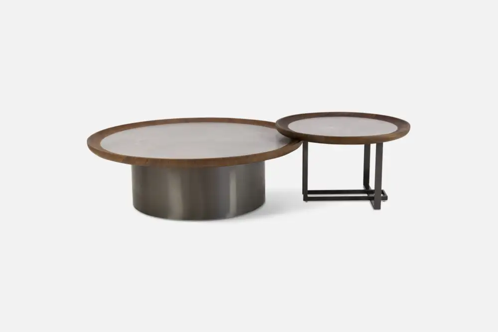 KEENAN Coffee Table 95 Round with Grey Sintered Stone & Walnut Border & Titanium Base