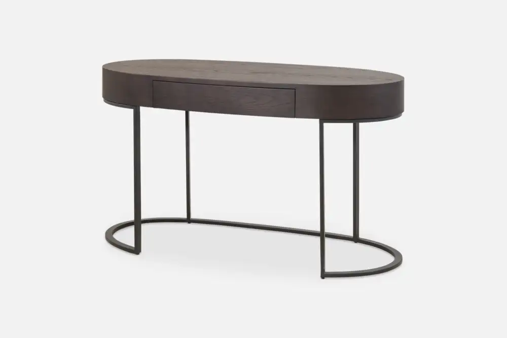 Boasting a sleek treated oak body and black steel frame, bold curves and a minimalistic finish, the Scrivi Desk is truly showcased by its shape. Make the most of your space with the endless potential of the Scrivi Desk, a comfortable daytime workspace, with a hidden vanity to house your work, valuables or make up, complete with an internal mirror and removable compartments.