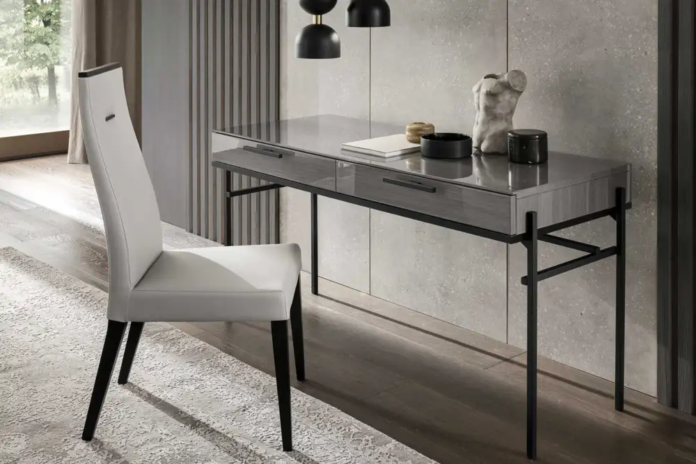 Sleek, sophisticated, and effortlessly versatile, NOVECENTO features a high-gloss Silverwood veneer, enhanced with six layers of lacquer for a crisp, polished finish. With black metal accents and generous storage, it’s perfect as a workspace or a chic dressing table. Designed and made in Italy, this statement piece embodies ALF Italia’s signature craftsmanship and modern elegance.