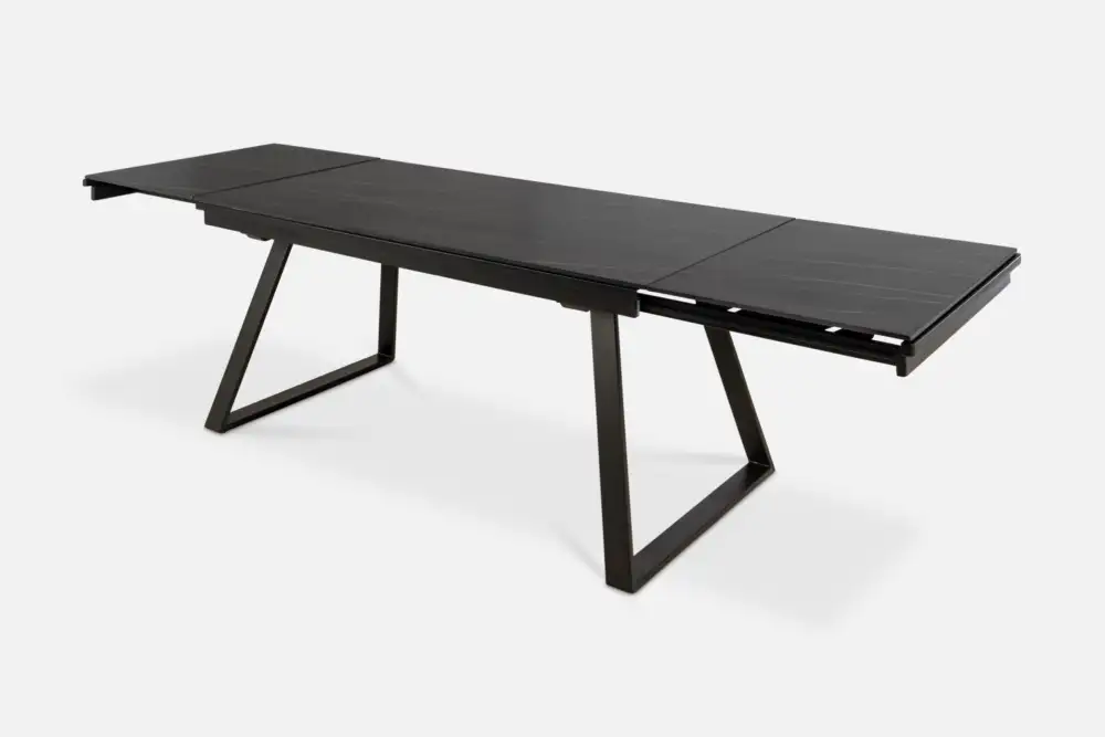 Experience a stylish and convenient solution for modern living with the RHINE dining table. Crafted from luxurious black & gold sintered stone, this extendable piece effortlessly adapts to your needs. It extends from 1.6m to over 2.75m, allowing for compact dining during everyday use while easily providing ample space for entertaining guests.