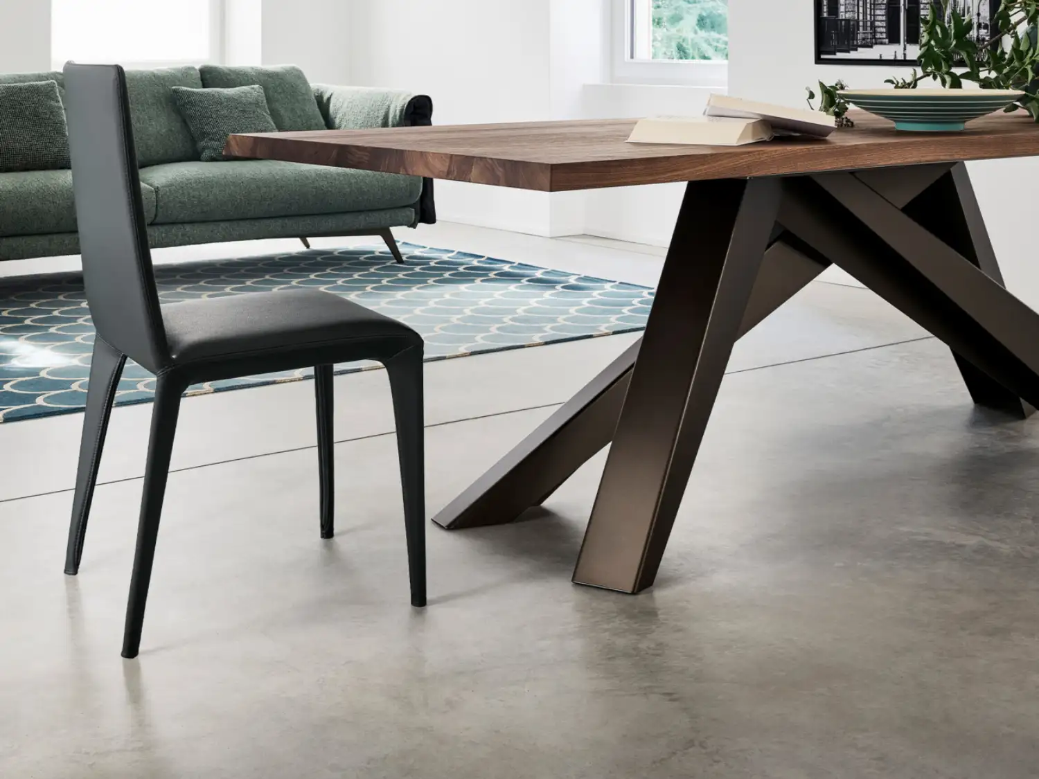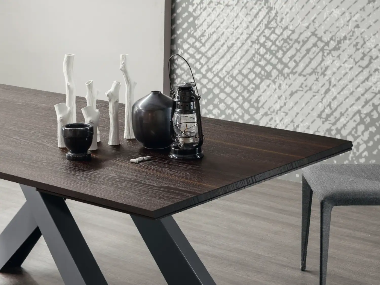 The dynamic angled legs are balanced out by the thick rectangular top for a visually stable statement piece.