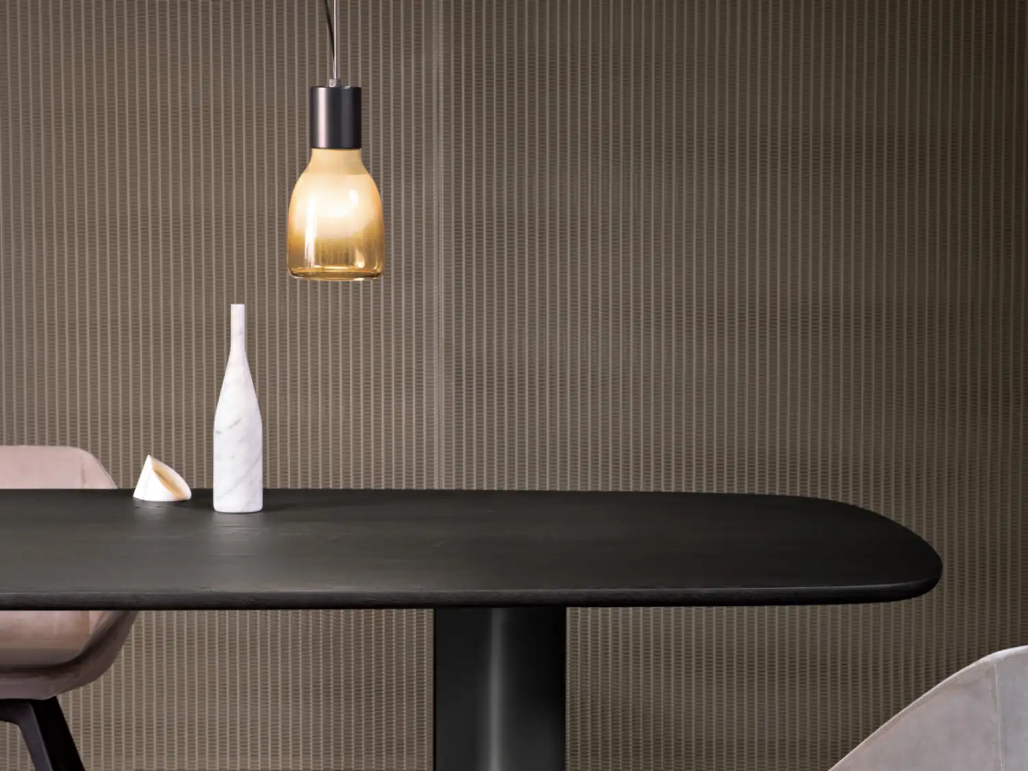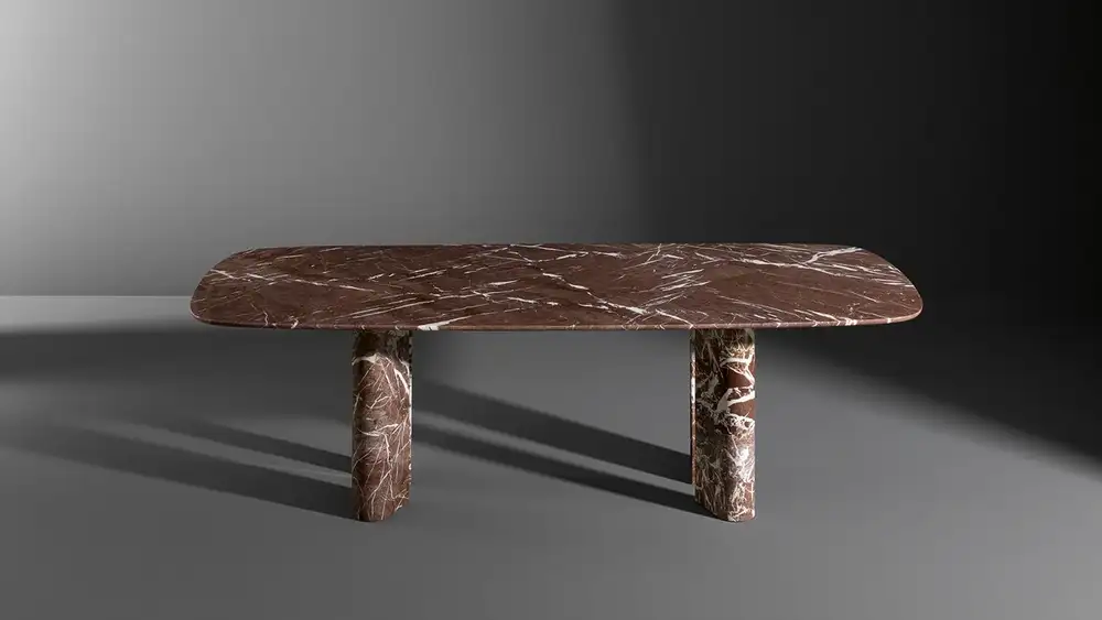 A bold, sculptural form that shifts with every angle, this dining table plays with light and perspective. Its seamless top has a smooth, refined finish that anchors the space with understated elegance.