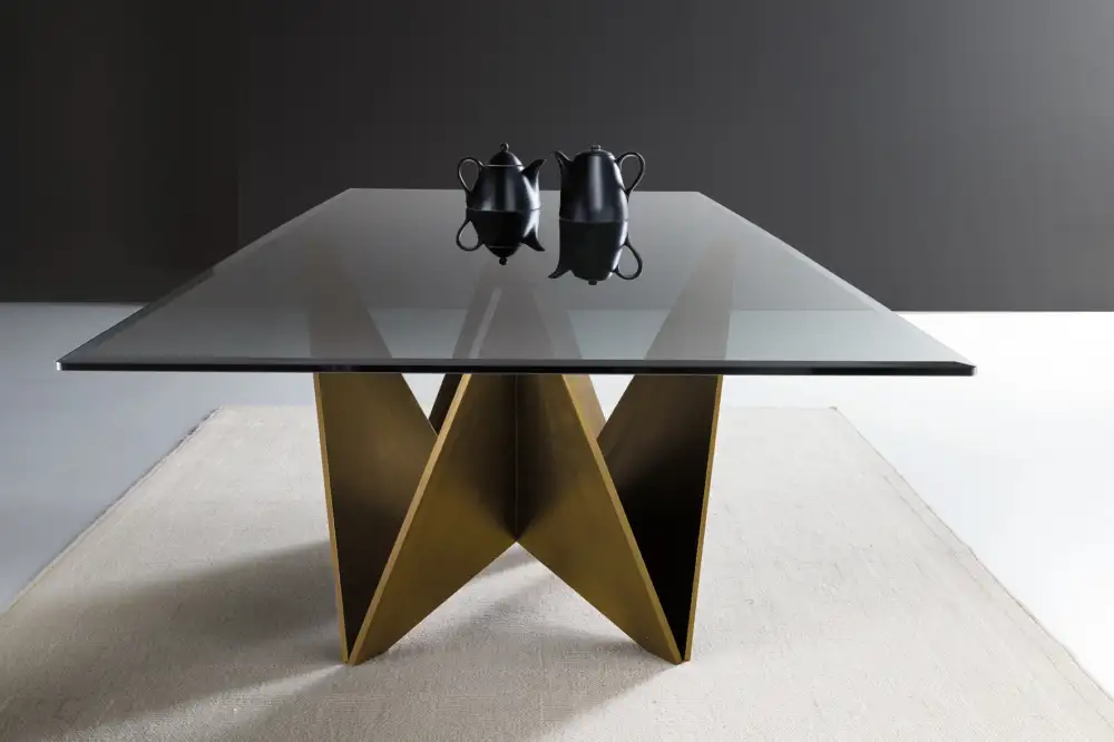 The ultra-original base of the ORIGAMI uses metal “folds” like a sheet of paper to create a new shape reminiscent of the traditional Japanese art of paper folding. The expertly moulded base is available in the black-grey lacquered finish or in brushed bronze and the top in stoneware, veneer or solid oak or, in the elegant version with bevel-edged smoked glass which highlights the original details of the structure. Made in Italy and also available square or as an extension table.