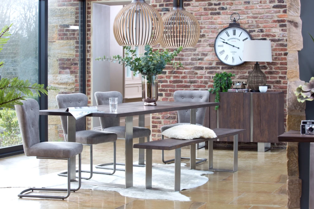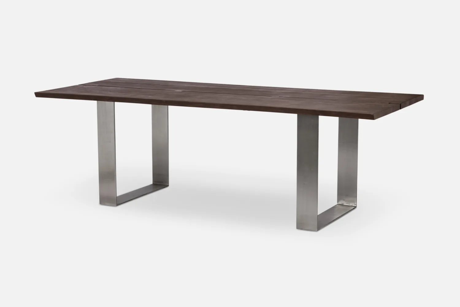 Rustic-chic meets industrial style in this table made to last. Distressed wood is contrasted by a contemporary brushed stainless steel base. Crafted from wild grained oak, each table top is hand carved, highlighting grain variation to create a natural and relaxed look.
