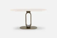 With an elongated travertine top and a bold open-frame base, FORCHETTA balances lightness and strength in a beautifully sculptural way.